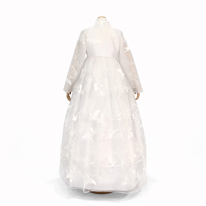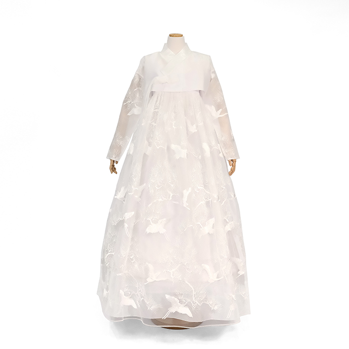 순백의 빛으로 단아함을 담아낸 점사복입니다. 저고리와 치마에는 맑고 투명한 원단 위에 정교하게 수놓인 학과 자연의 문양은 착용하는 이의 기품과 신성한 기운을 더욱 돋보이게 합니다.