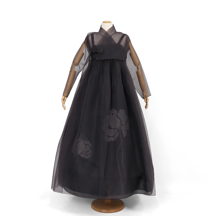 깊은 밤색의 고운 시스루 원단 위에 은은하게 드러나는 꽃 자수가 더해진 점사복 한복입니다. 차분하고 단정한 분위기를 자아내는 짙은 색감은 엄숙함과 신성함을 상징하는 시스루 저고리와 치마에는투명하게 겹쳐진 원단은 움직임에 따라 은근한 빛을 머금어 세련된 멋을 더하여 전통의 단정미와 현대적인 감각이 어우러진 이 한 벌은,착용자의 존재감을 빛내며 점사의 순간을 더욱 특별하게 만들어 줍니다.